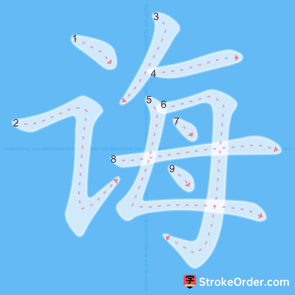 Watch the video of writing the Chinese character "诲", learn the correct stroke order (笔顺) of the character "诲", and master the standard way of writing the character "诲".