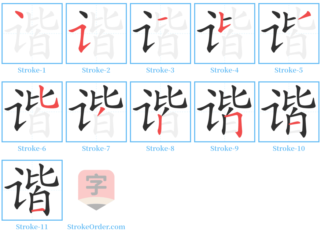 Watch the video of writing the Chinese character "谐", learn the correct stroke order (笔顺) of the character "谐", and master the standard way of writing the character "谐".