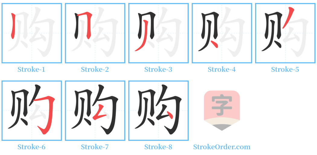 Watch the video of writing the Chinese character "购", learn the correct stroke order (笔顺) of the character "购", and master the standard way of writing the character "购".