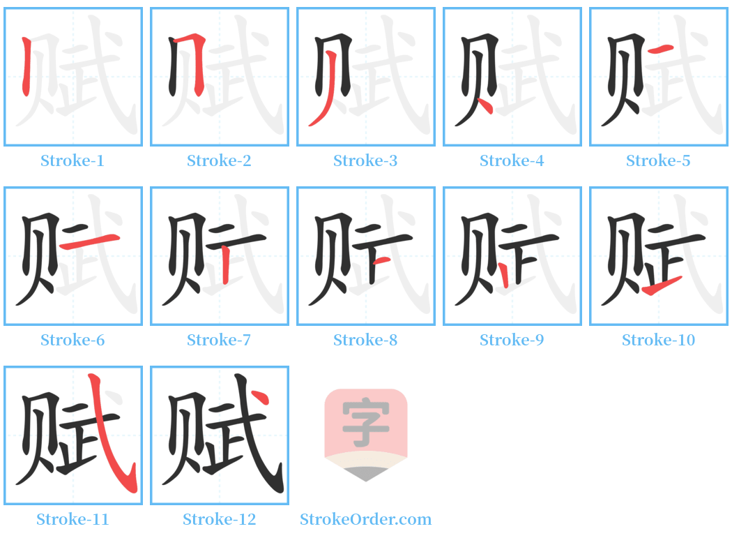 Watch the video of writing the Chinese character "赋", learn the correct stroke order (笔顺) of the character "赋", and master the standard way of writing the character "赋".