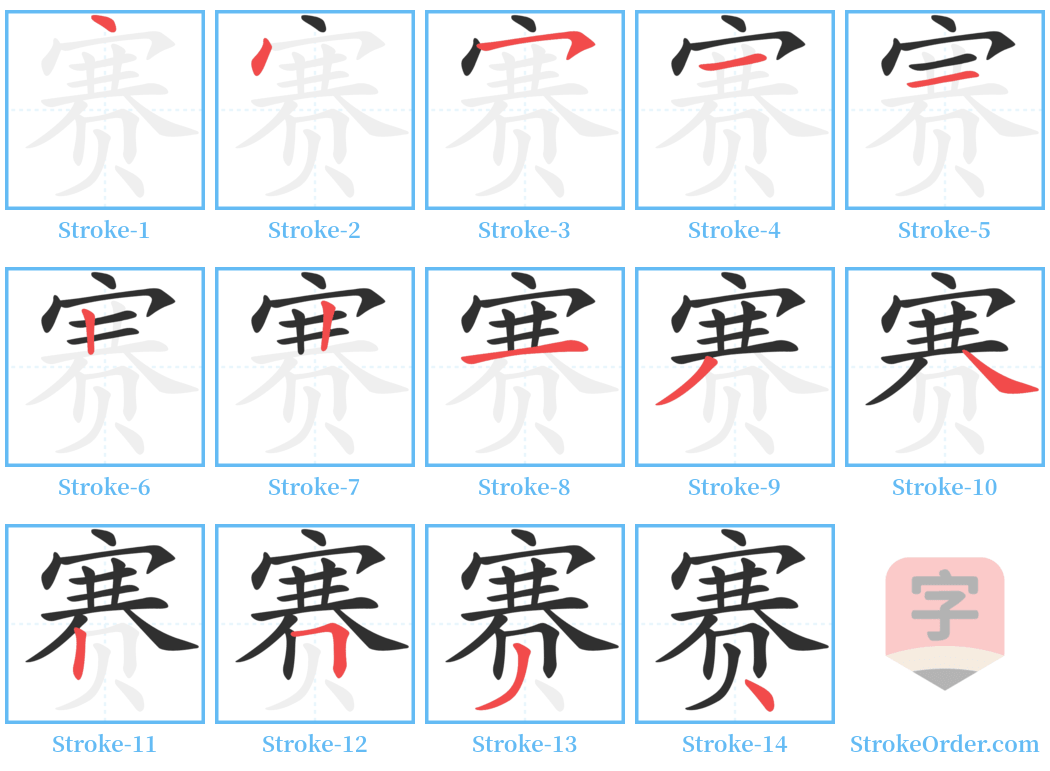 Watch the video of writing the Chinese character "赛", learn the correct stroke order (笔顺) of the character "赛", and master the standard way of writing the character "赛".