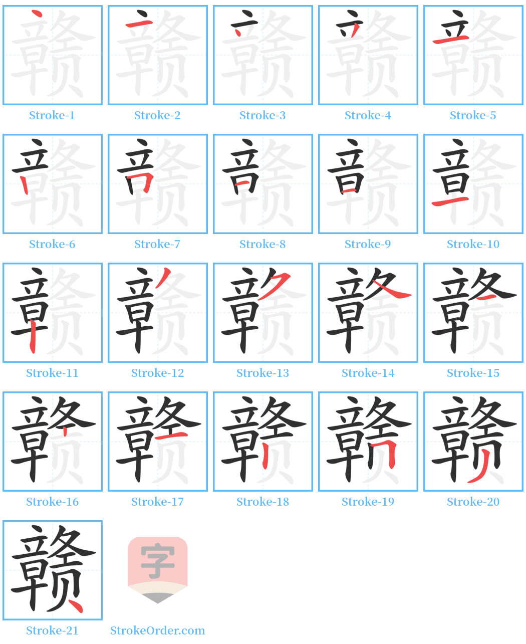 Watch the video of writing the Chinese character "赣", learn the correct stroke order (笔顺) of the character "赣", and master the standard way of writing the character "赣".