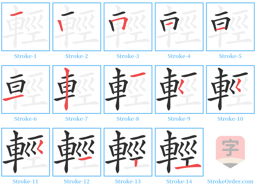 Watch the video of writing the Chinese character "輕", learn the correct stroke order (笔顺) of the character "輕", and master the standard way of writing the character "輕".