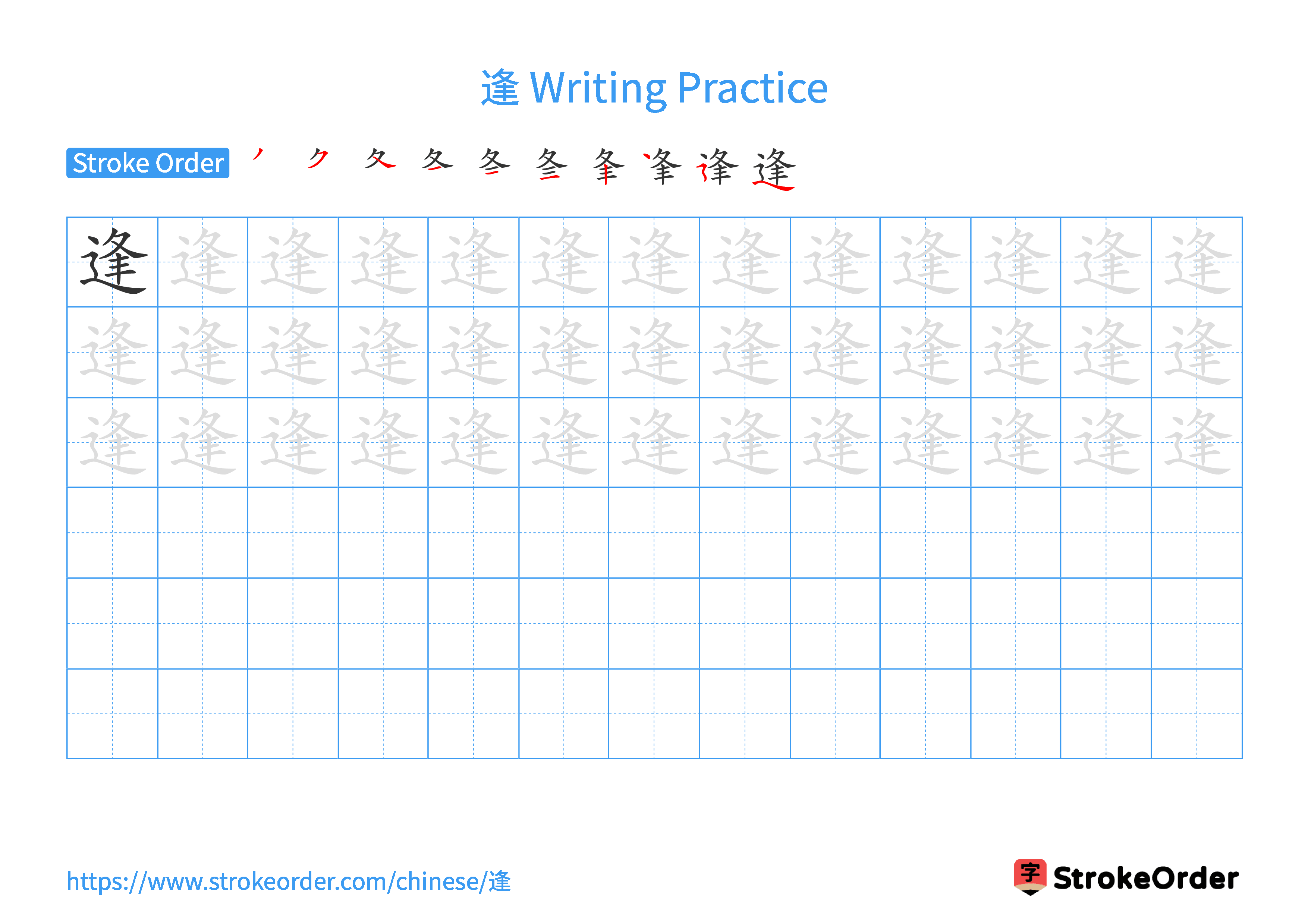 Printable Writing Practice Worksheet of "逢" in Landscape Orientation (Tian Zi Ge)