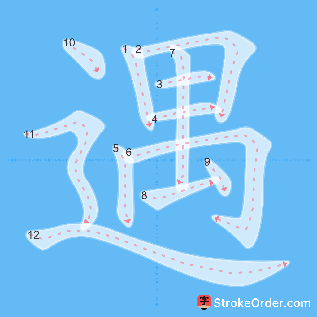 Watch the video of writing the Chinese character "遇", learn the correct stroke order (笔顺) of the character "遇", and master the standard way of writing the character "遇".