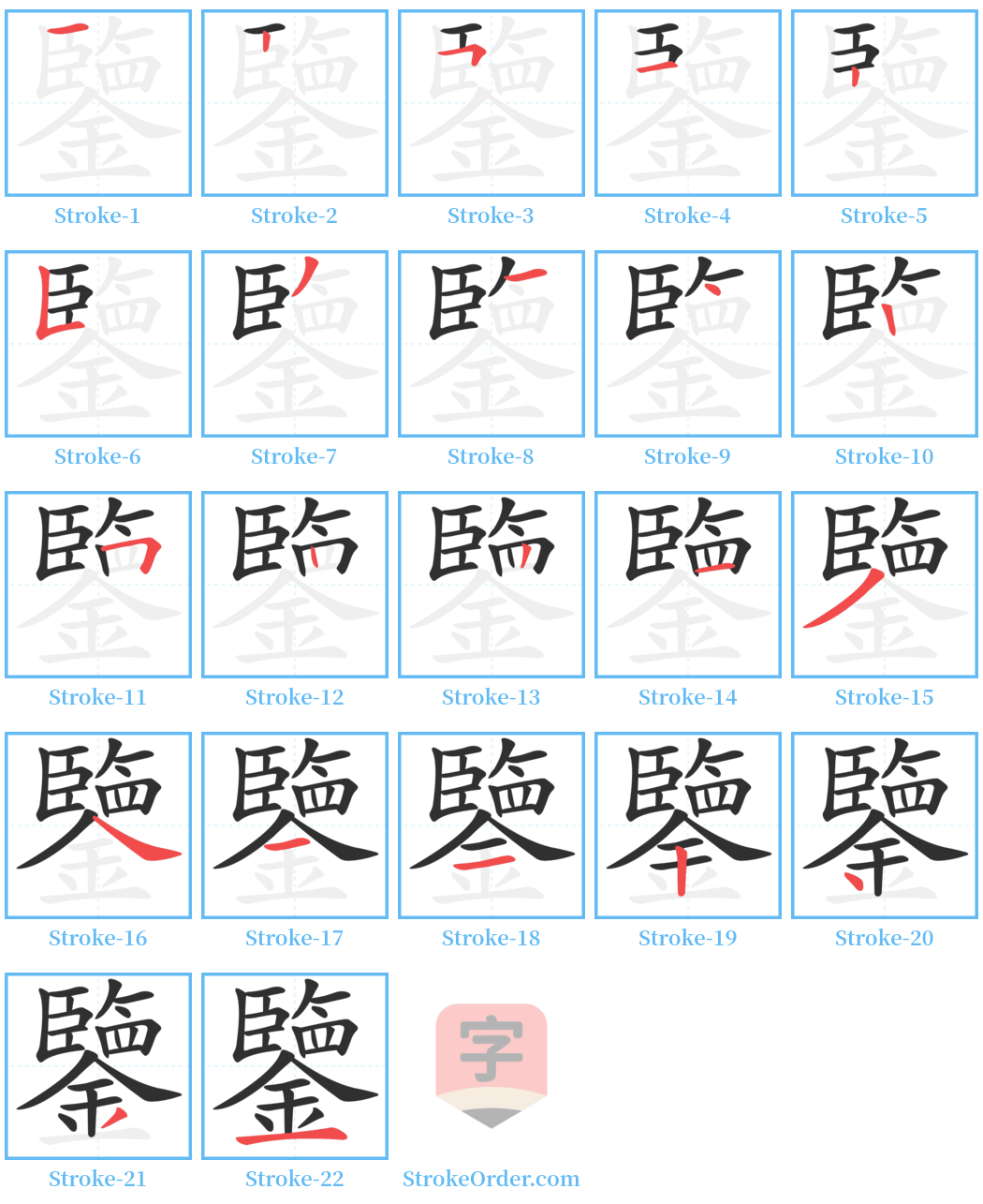 Watch the video of writing the Chinese character "鑒", learn the correct stroke order (笔顺) of the character "鑒", and master the standard way of writing the character "鑒".