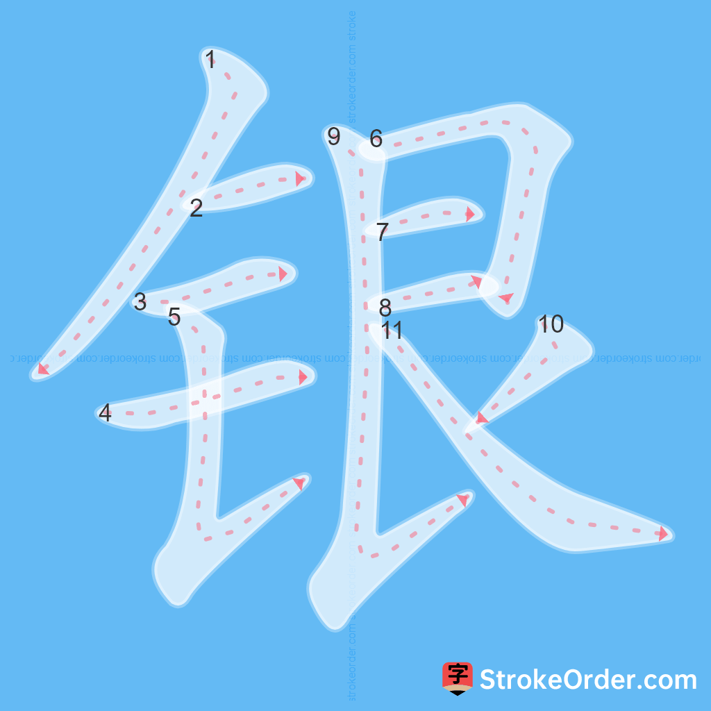 Watch the video of writing the Chinese character "银", learn the correct stroke order (笔顺) of the character "银", and master the standard way of writing the character "银".