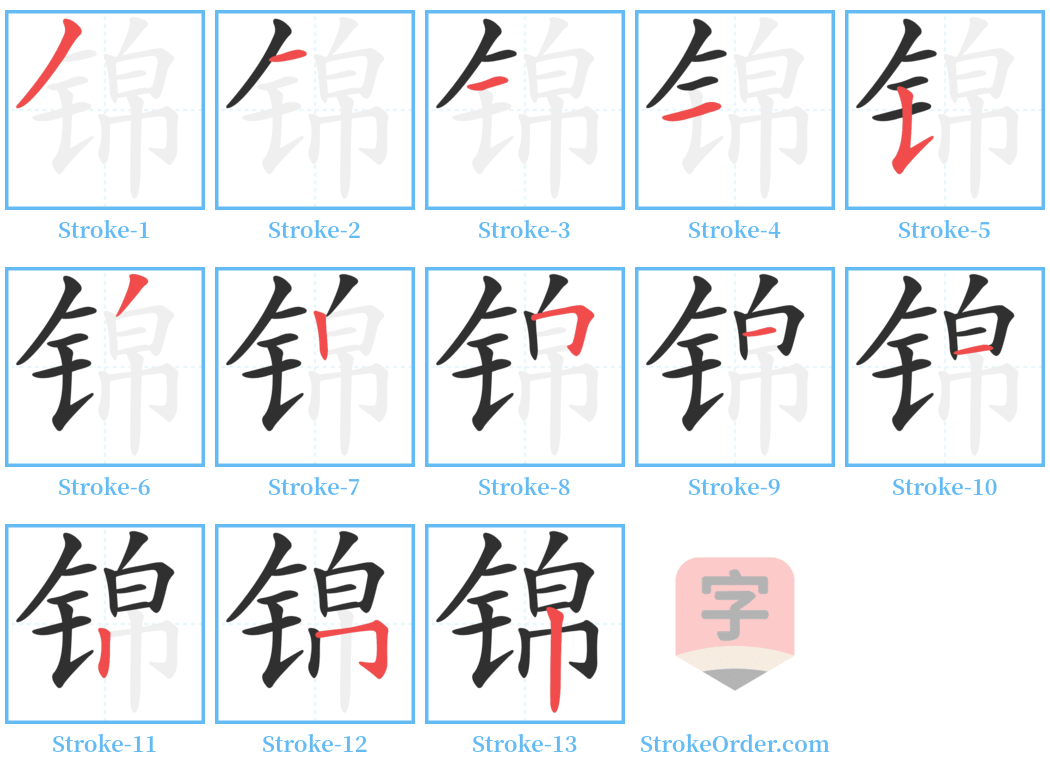 Watch the video of writing the Chinese character "锦", learn the correct stroke order (笔顺) of the character "锦", and master the standard way of writing the character "锦".