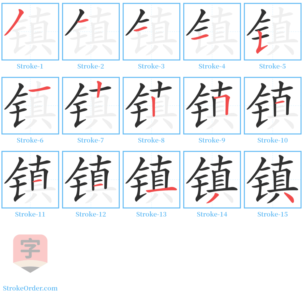Watch the video of writing the Chinese character "镇", learn the correct stroke order (笔顺) of the character "镇", and master the standard way of writing the character "镇".