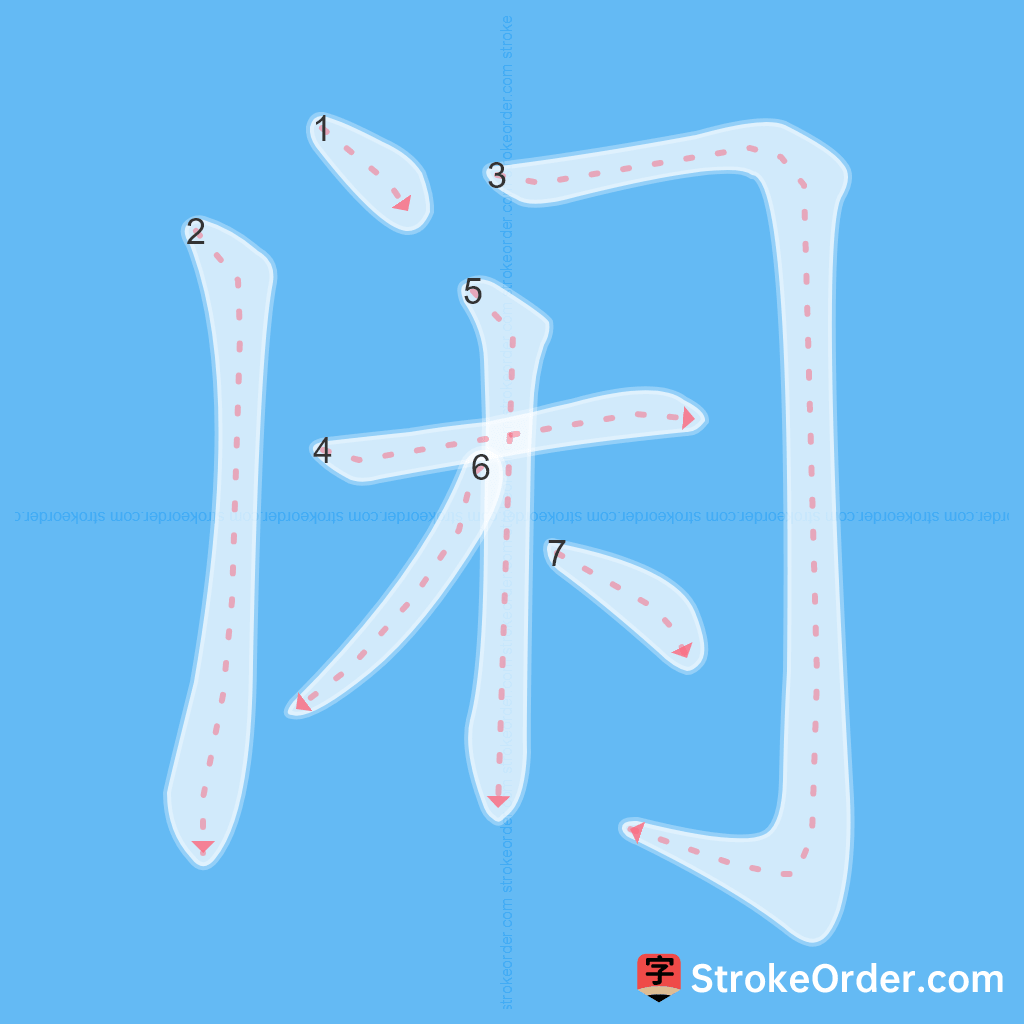 Watch the video of writing the Chinese character "闲", learn the correct stroke order (笔顺) of the character "闲", and master the standard way of writing the character "闲".