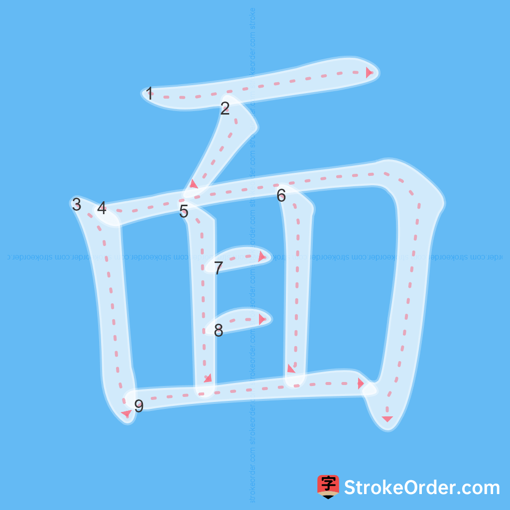 Watch the video of writing the Chinese character "面", learn the correct stroke order (笔顺) of the character "面", and master the standard way of writing the character "面".
