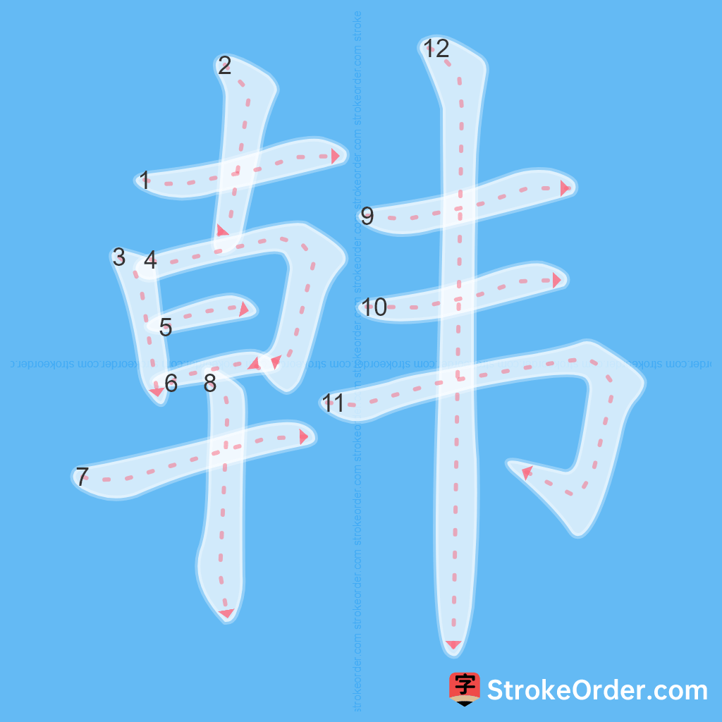 Watch the video of writing the Chinese character "韩", learn the correct stroke order (笔顺) of the character "韩", and master the standard way of writing the character "韩".