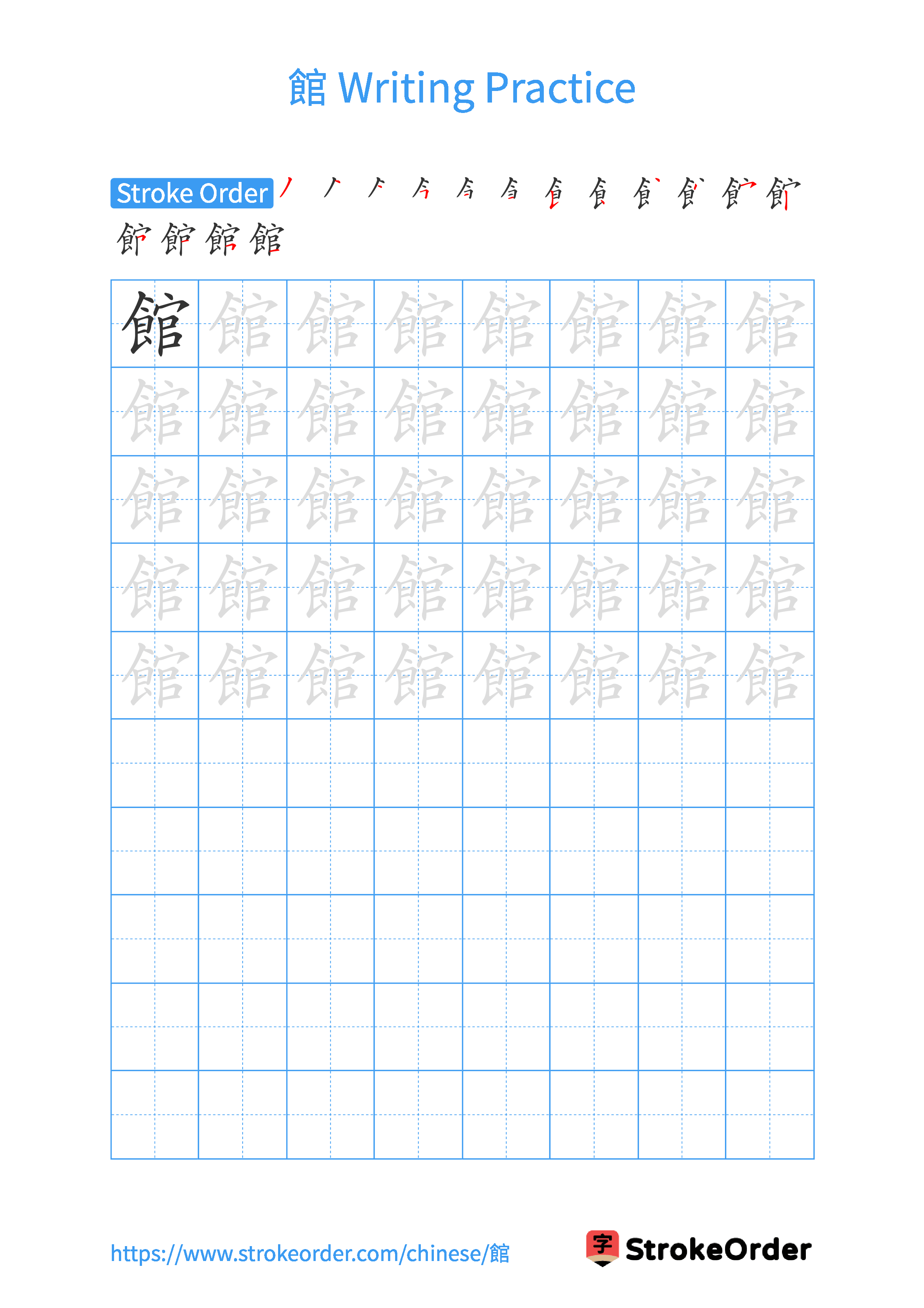 Printable Writing Practice Worksheet of "館" in Portrait Orientation (Tian Zi Ge)