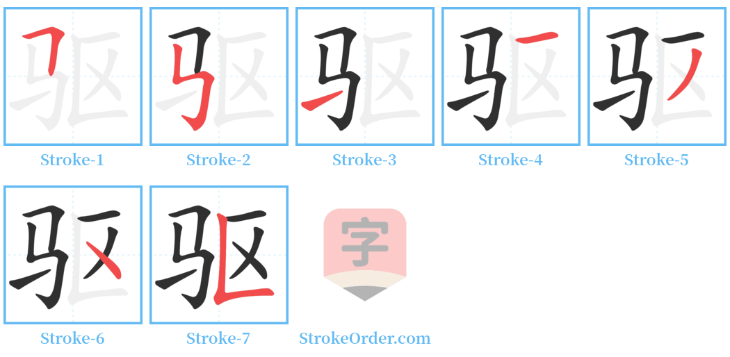 Watch the video of writing the Chinese character "驱", learn the correct stroke order (笔顺) of the character "驱", and master the standard way of writing the character "驱".